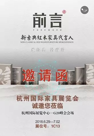 6月29日至7月2日,杭州国际家具展将于杭州G20峰会主会场——杭州国际博览中心盛大举行。浙江中信红木家具有限公司(以下简称中信红木)旗下高端品牌“前言”以全新的运作模式、一流的产品工艺、成熟的团队服务机制参展杭州国际家具展,其展位号为1C13。