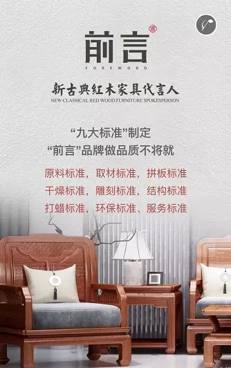 以高品质为市场撬杠,“前言”制定九大标准,既原料标准、取材标准、拼板标准、干燥标准、雕刻标准、结构标准、打蜡标准、环保标准、服务标准。九大标准的制定是中信红木二十余年红木家具生产经验的结晶,也是行业产品生产的最高标准。