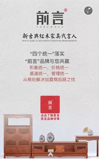 近年来,红木家具频频亮相国际舞台,雅致东方生活方式成为时代潮流。此时,择一广阔市场前景的红木品牌加盟,占尽天时、地利、人和。中信红木高端品牌“前言”的盛大招商便是一次难得一遇的财富机会。6月29日至7月2日,“前言”热忱欢迎广大经销商朋友届时前来杭州国际家具展1C13展位洽谈合作事宜!