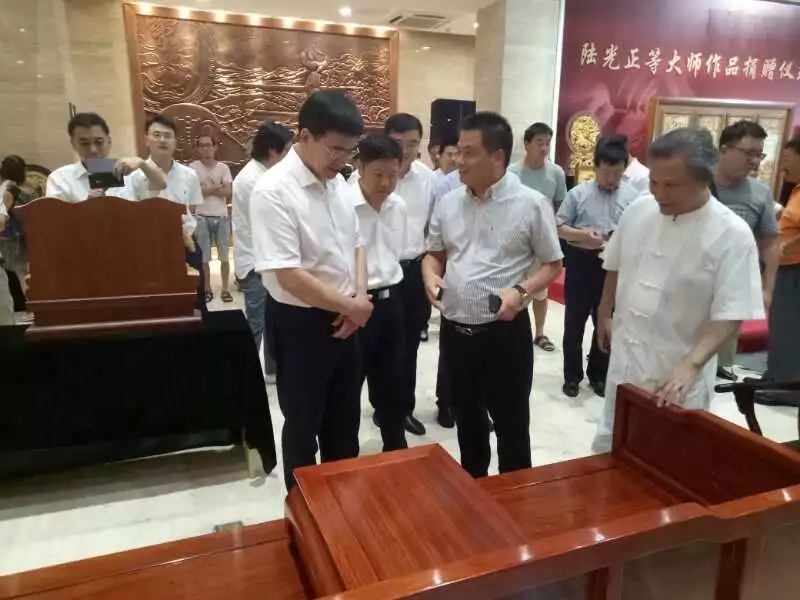 金华市市委书记陈龙,金华市副市长祝伦根,金华市副市长、东阳市市委书记黄敏和亚太地区手工艺大师、中国工艺美术大师陆光正点赞“前言”产品