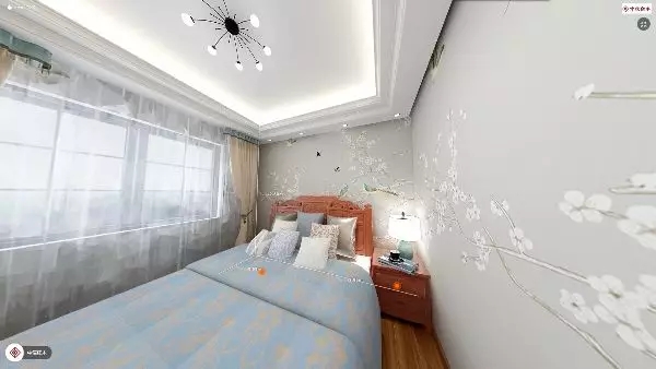 客厅基调统一,多种布艺的软装搭配上硅藻泥的背景墙和简约装饰画让整体柔和,绿植很好的起到了点缀的作用;最让人惊艳的是次卧的墙纸,鸟语花香,加上红木家具搭配呈现出舒适的田园风。