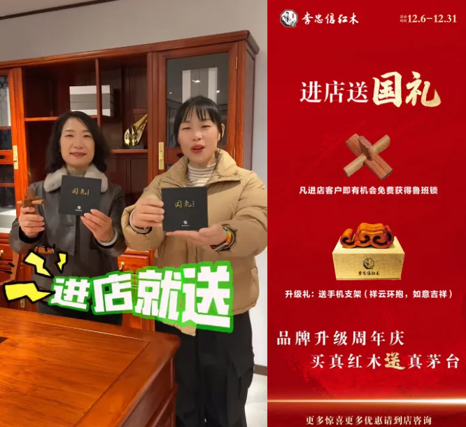 更大力度的折扣,更多实在的回馈为终端门店赋能,全国门店同步上线,高档红木家具、奢华中式别院、国礼鲁班锁、礼爱同心凳……李忠信红木文化节,一次上齐!